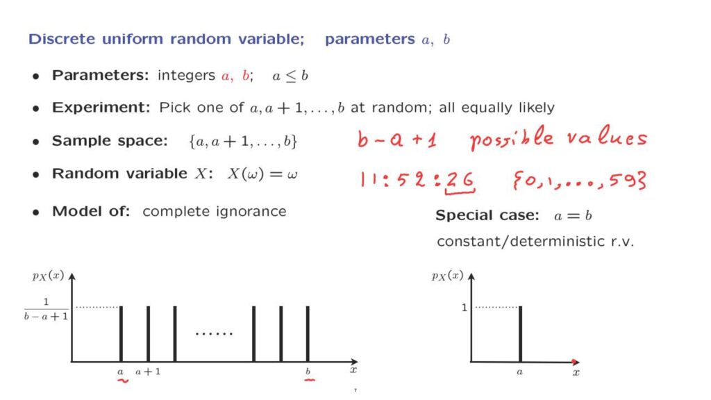 In this segment and the next two, we will introduce a few useful random variables that show up in many applications– discrete uniform random variables, binomial random variables, and geometric random variables So let’s start with a discrete uniform.