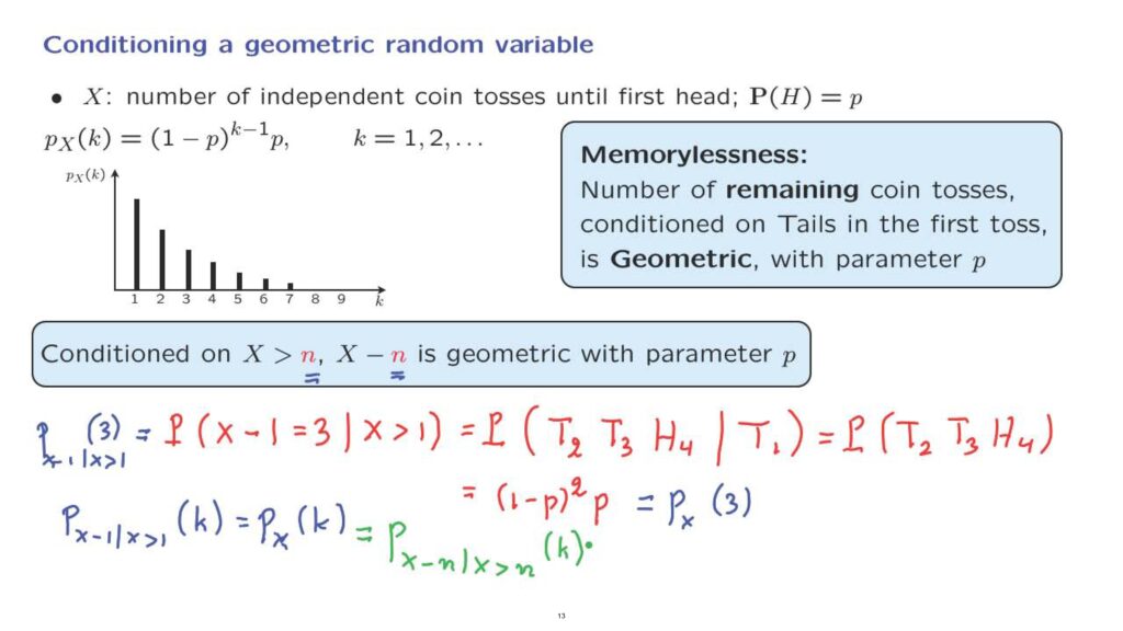 So the statement that we have been making is the following in more mathematical language– that conditioned on X being larger than 1, the random variable X minus 1, which is the remaining number of coin tosses, has a geometric distribution with parameter p.