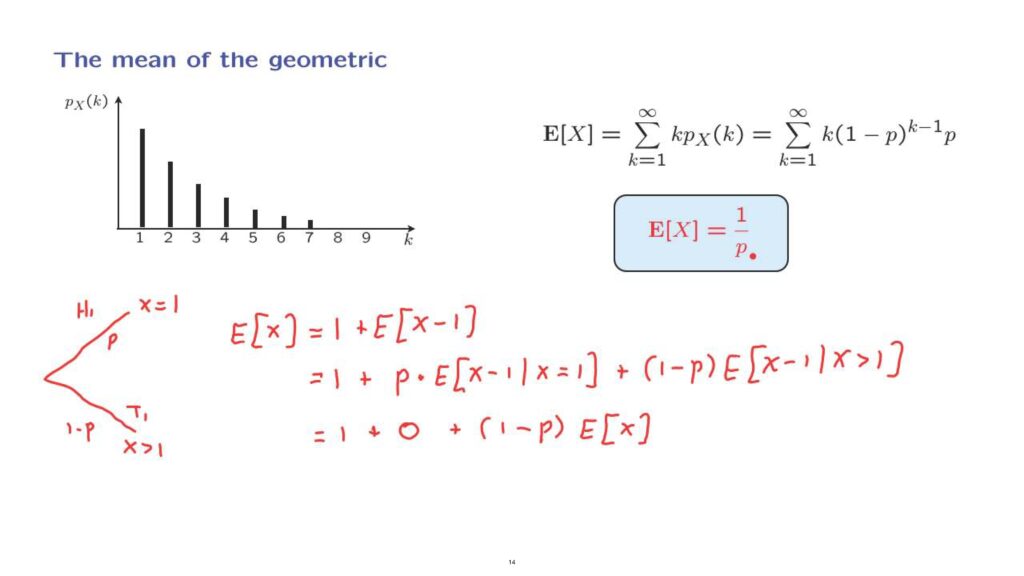 We will now exploit the Memorylessness property of the geometric PMF and use it together with the total expectation theorem to calculate the mean or expectation of the geometric PMF.