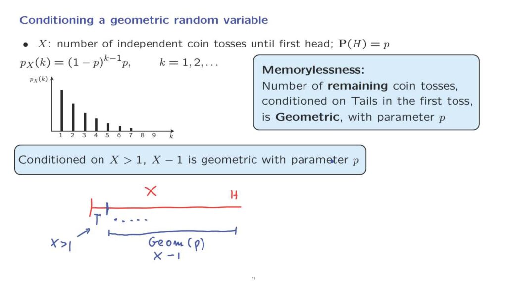 So the statement that we have been making is the following in more mathematical language– that conditioned on X being larger than 1, the random variable X minus 1, which is the remaining number of coin tosses, has a geometric distribution with parameter p.