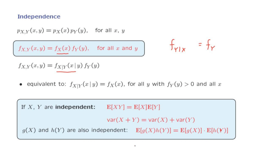Finally, let us note some consequences of independence, which are identical to the corresponding properties that we had in the discrete case, and the proofs are also exactly the same.