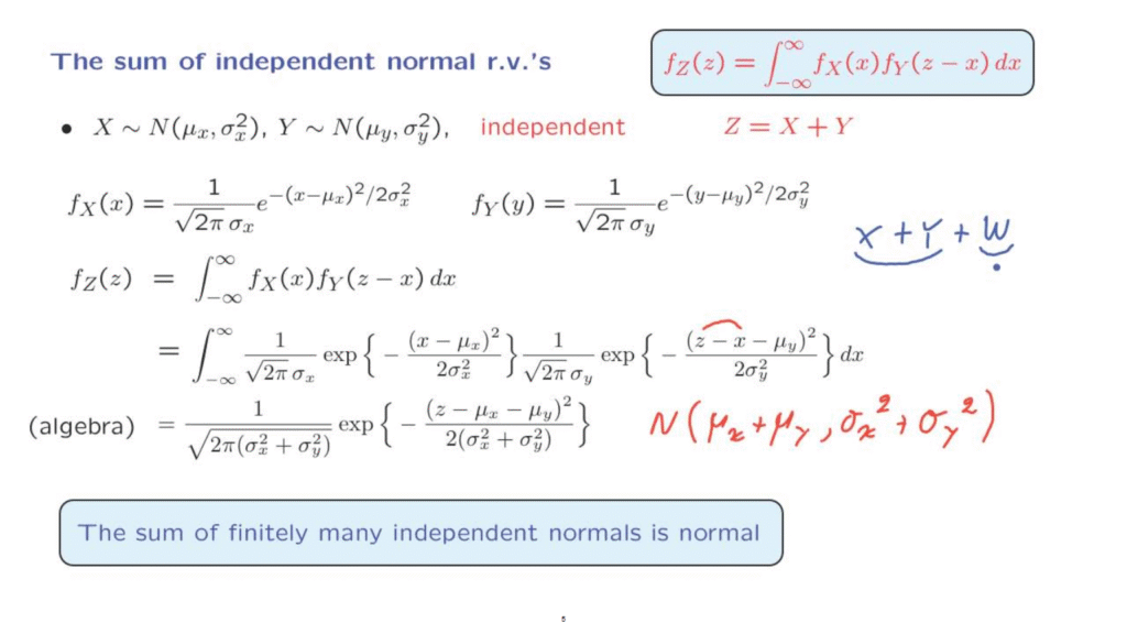 And we continue this argument by induction, and conclude that more generally, the sum of any finite number of independent normal random variables is normal.
