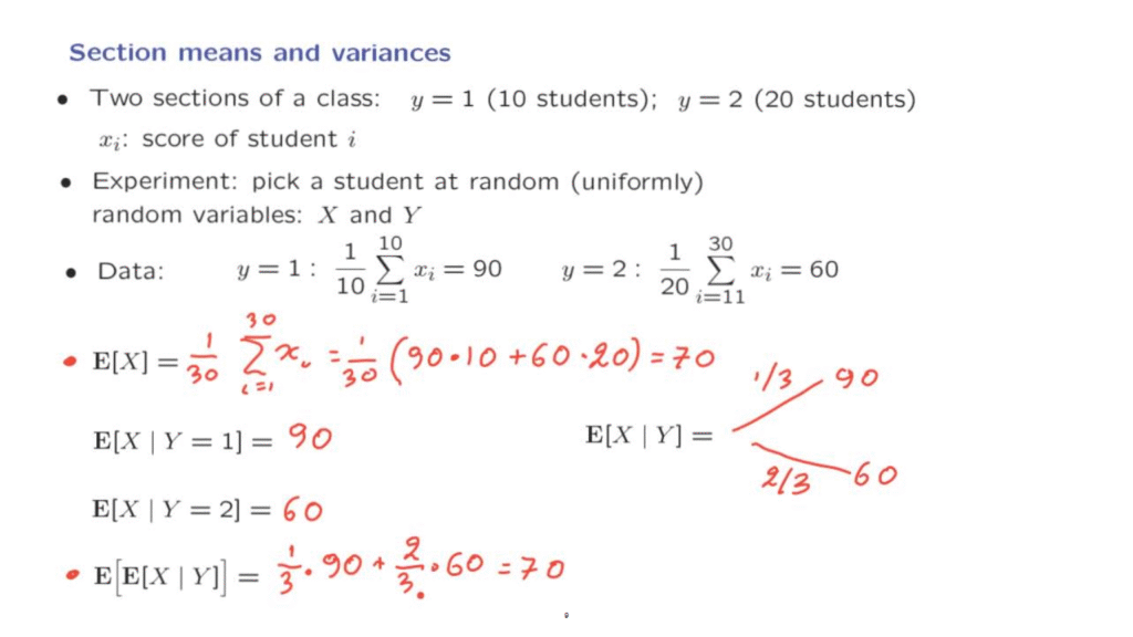 Similarly for the second section, the expected value of the score of a randomly selected student, given that the student belongs in that section, is equal to 60.