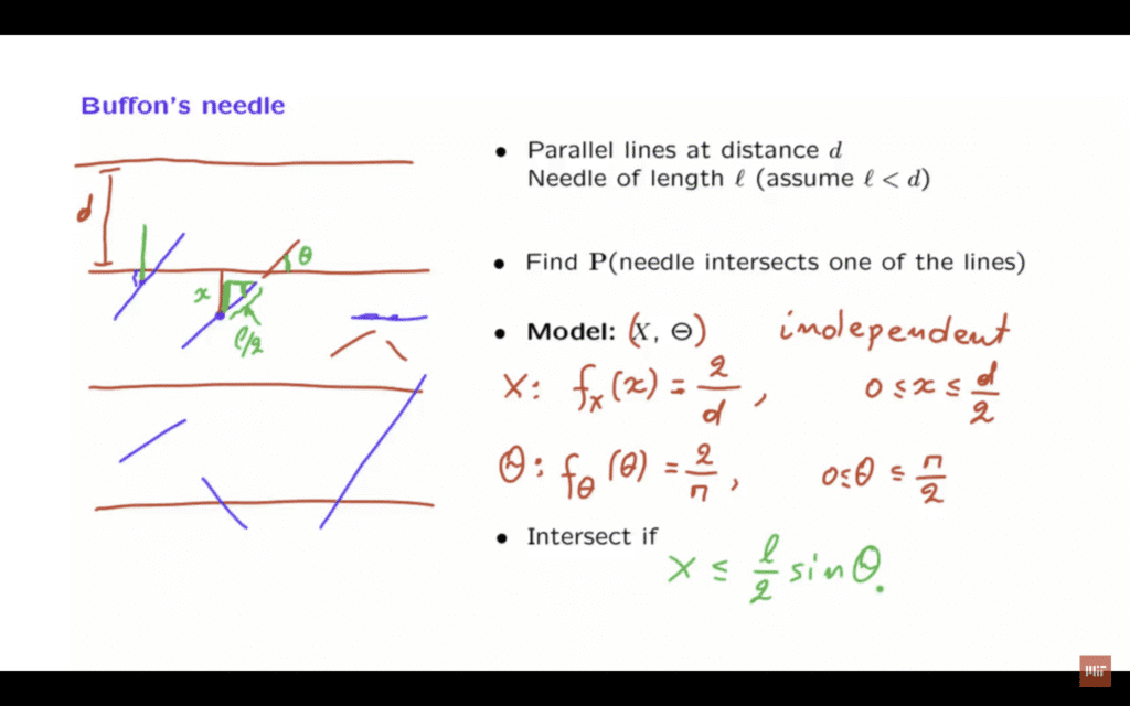 So in this setting, we’re interested in the question of how likely is it that the needle is going to intersect one of the lines if the needle is thrown completely at random? We will answer this question, and we will proceed as follows.