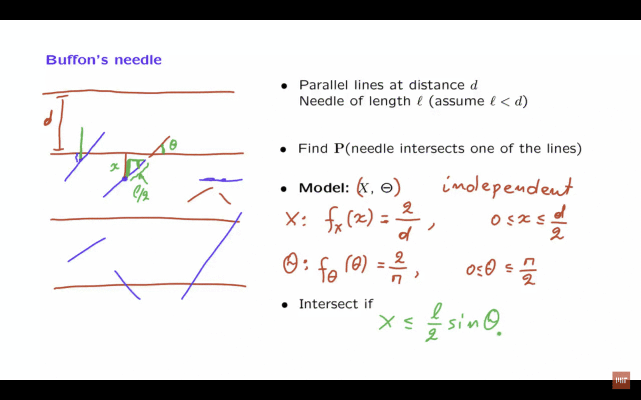 So if I tell you x and theta, you know how far away the needle is from the nearest line, and at what angle it is.