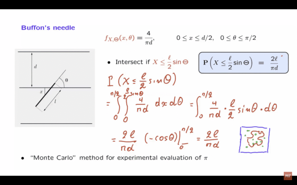 How can you figure out the number pi? Take your needle, throw it at random a million times, and count the frequency with which the needle ends up crossing the line.
