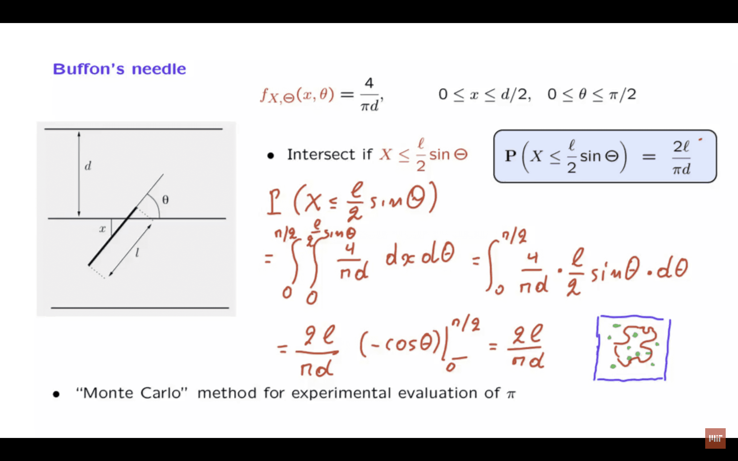 And if you know the length of your needle and of the distance between the different lines, you can use the estimate of that number to determine the value of pi.